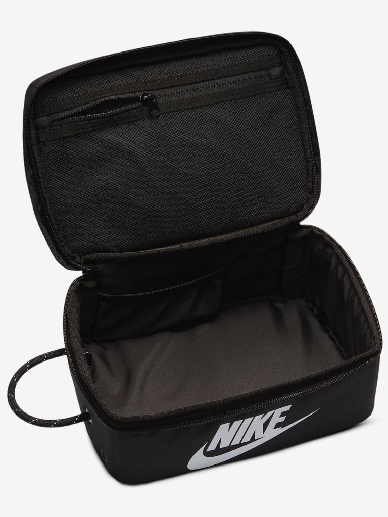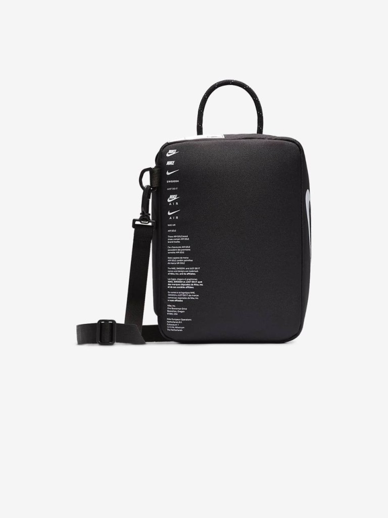 - این کیف دارای محل نگهداری جوراب، لوازم جانبی و توری اضافی است و شبیه جعبه کلاسیک نایک است. یک بند قابل تنظیم با یک دسته طناب کشی جفت شده است تا حمل را آسان کند.
